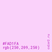 Цвет #FAD1FA в цветовой модели RGB обозначается тремя октетами (250, 209, 250) в десятичном формате и #FAD1FA в шестнадцатиричном (hex) формате, которые являются интенсивностью красного 250 (hex FA), интенсивность зелёного 209 (hex D1) и интенсивность синего 250 (hex FA).