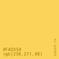 Цвет #FAD358 в цветовой модели RGB обозначается тремя октетами (250, 211, 88) в десятичном формате и #FAD358 в шестнадцатиричном (hex) формате, которые являются интенсивностью красного 250 (hex FA), интенсивность зелёного 211 (hex D3) и интенсивность синего 88 (hex 58).