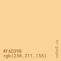 Цвет #FAD39B в цветовой модели RGB обозначается тремя октетами (250, 211, 155) в десятичном формате и #FAD39B в шестнадцатиричном (hex) формате, которые являются интенсивностью красного 250 (hex FA), интенсивность зелёного 211 (hex D3) и интенсивность синего 155 (hex 9B).