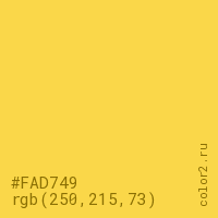 Цвет #FAD749 в цветовой модели RGB обозначается тремя октетами (250, 215, 73) в десятичном формате и #FAD749 в шестнадцатиричном (hex) формате, которые являются интенсивностью красного 250 (hex FA), интенсивность зелёного 215 (hex D7) и интенсивность синего 73 (hex 49).