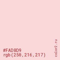 Цвет #FAD8D9 в цветовой модели RGB обозначается тремя октетами (250, 216, 217) в десятичном формате и #FAD8D9 в шестнадцатиричном (hex) формате, которые являются интенсивностью красного 250 (hex FA), интенсивность зелёного 216 (hex D8) и интенсивность синего 217 (hex D9).