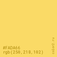 Цвет #FADA66 в цветовой модели RGB обозначается тремя октетами (250, 218, 102) в десятичном формате и #FADA66 в шестнадцатиричном (hex) формате, которые являются интенсивностью красного 250 (hex FA), интенсивность зелёного 218 (hex DA) и интенсивность синего 102 (hex 66).