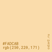 Цвет #FADCAB в цветовой модели RGB обозначается тремя октетами (250, 220, 171) в десятичном формате и #FADCAB в шестнадцатиричном (hex) формате, которые являются интенсивностью красного 250 (hex FA), интенсивность зелёного 220 (hex DC) и интенсивность синего 171 (hex AB).
