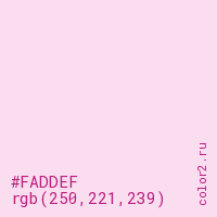Цвет #FADDEF в цветовой модели RGB обозначается тремя октетами (250, 221, 239) в десятичном формате и #FADDEF в шестнадцатиричном (hex) формате, которые являются интенсивностью красного 250 (hex FA), интенсивность зелёного 221 (hex DD) и интенсивность синего 239 (hex EF).