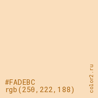 Цвет #FADEBC в цветовой модели RGB обозначается тремя октетами (250, 222, 188) в десятичном формате и #FADEBC в шестнадцатиричном (hex) формате, которые являются интенсивностью красного 250 (hex FA), интенсивность зелёного 222 (hex DE) и интенсивность синего 188 (hex BC).