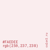 Цвет #FAEDEE в цветовой модели RGB обозначается тремя октетами (250, 237, 238) в десятичном формате и #FAEDEE в шестнадцатиричном (hex) формате, которые являются интенсивностью красного 250 (hex FA), интенсивность зелёного 237 (hex ED) и интенсивность синего 238 (hex EE).
