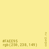 Цвет #FAEE95 в цветовой модели RGB обозначается тремя октетами (250, 238, 149) в десятичном формате и #FAEE95 в шестнадцатиричном (hex) формате, которые являются интенсивностью красного 250 (hex FA), интенсивность зелёного 238 (hex EE) и интенсивность синего 149 (hex 95).