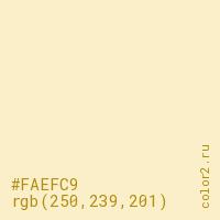 Цвет #FAEFC9 в цветовой модели RGB обозначается тремя октетами (250, 239, 201) в десятичном формате и #FAEFC9 в шестнадцатиричном (hex) формате, которые являются интенсивностью красного 250 (hex FA), интенсивность зелёного 239 (hex EF) и интенсивность синего 201 (hex C9).
