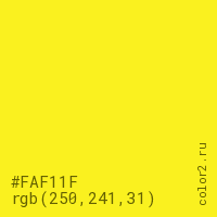 Цвет #FAF11F в цветовой модели RGB обозначается тремя октетами (250, 241, 31) в десятичном формате и #FAF11F в шестнадцатиричном (hex) формате, которые являются интенсивностью красного 250 (hex FA), интенсивность зелёного 241 (hex F1) и интенсивность синего 31 (hex 1F).