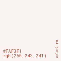 Цвет #FAF3F1 в цветовой модели RGB обозначается тремя октетами (250, 243, 241) в десятичном формате и #FAF3F1 в шестнадцатиричном (hex) формате, которые являются интенсивностью красного 250 (hex FA), интенсивность зелёного 243 (hex F3) и интенсивность синего 241 (hex F1).