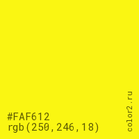 Цвет #FAF612 в цветовой модели RGB обозначается тремя октетами (250, 246, 18) в десятичном формате и #FAF612 в шестнадцатиричном (hex) формате, которые являются интенсивностью красного 250 (hex FA), интенсивность зелёного 246 (hex F6) и интенсивность синего 18 (hex 12).