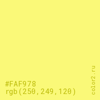 Цвет #FAF978 в цветовой модели RGB обозначается тремя октетами (250, 249, 120) в десятичном формате и #FAF978 в шестнадцатиричном (hex) формате, которые являются интенсивностью красного 250 (hex FA), интенсивность зелёного 249 (hex F9) и интенсивность синего 120 (hex 78).
