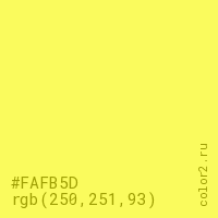 Цвет #FAFB5D в цветовой модели RGB обозначается тремя октетами (250, 251, 93) в десятичном формате и #FAFB5D в шестнадцатиричном (hex) формате, которые являются интенсивностью красного 250 (hex FA), интенсивность зелёного 251 (hex FB) и интенсивность синего 93 (hex 5D).