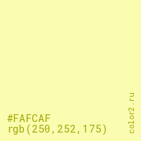 Цвет #FAFCAF в цветовой модели RGB обозначается тремя октетами (250, 252, 175) в десятичном формате и #FAFCAF в шестнадцатиричном (hex) формате, которые являются интенсивностью красного 250 (hex FA), интенсивность зелёного 252 (hex FC) и интенсивность синего 175 (hex AF).