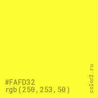 Цвет #FAFD32 в цветовой модели RGB обозначается тремя октетами (250, 253, 50) в десятичном формате и #FAFD32 в шестнадцатиричном (hex) формате, которые являются интенсивностью красного 250 (hex FA), интенсивность зелёного 253 (hex FD) и интенсивность синего 50 (hex 32).