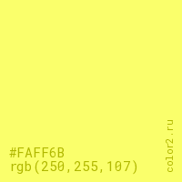 Цвет #FAFF6B в цветовой модели RGB обозначается тремя октетами (250, 255, 107) в десятичном формате и #FAFF6B в шестнадцатиричном (hex) формате, которые являются интенсивностью красного 250 (hex FA), интенсивность зелёного 255 (hex FF) и интенсивность синего 107 (hex 6B).