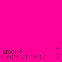 Цвет #FB0197 в цветовой модели RGB обозначается тремя октетами (251, 1, 151) в десятичном формате и #FB0197 в шестнадцатиричном (hex) формате, которые являются интенсивностью красного 251 (hex FB), интенсивность зелёного 1 (hex 01) и интенсивность синего 151 (hex 97).