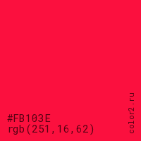 Цвет #FB103E в цветовой модели RGB обозначается тремя октетами (251, 16, 62) в десятичном формате и #FB103E в шестнадцатиричном (hex) формате, которые являются интенсивностью красного 251 (hex FB), интенсивность зелёного 16 (hex 10) и интенсивность синего 62 (hex 3E).