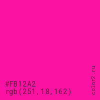 Цвет #FB12A2 в цветовой модели RGB обозначается тремя октетами (251, 18, 162) в десятичном формате и #FB12A2 в шестнадцатиричном (hex) формате, которые являются интенсивностью красного 251 (hex FB), интенсивность зелёного 18 (hex 12) и интенсивность синего 162 (hex A2).