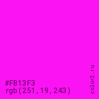 Цвет #FB13F3 в цветовой модели RGB обозначается тремя октетами (251, 19, 243) в десятичном формате и #FB13F3 в шестнадцатиричном (hex) формате, которые являются интенсивностью красного 251 (hex FB), интенсивность зелёного 19 (hex 13) и интенсивность синего 243 (hex F3).