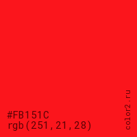 Цвет #FB151C в цветовой модели RGB обозначается тремя октетами (251, 21, 28) в десятичном формате и #FB151C в шестнадцатиричном (hex) формате, которые являются интенсивностью красного 251 (hex FB), интенсивность зелёного 21 (hex 15) и интенсивность синего 28 (hex 1C).