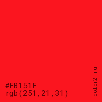 Цвет #FB151F в цветовой модели RGB обозначается тремя октетами (251, 21, 31) в десятичном формате и #FB151F в шестнадцатиричном (hex) формате, которые являются интенсивностью красного 251 (hex FB), интенсивность зелёного 21 (hex 15) и интенсивность синего 31 (hex 1F).