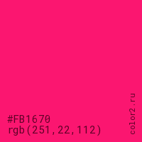 Цвет #FB1670 в цветовой модели RGB обозначается тремя октетами (251, 22, 112) в десятичном формате и #FB1670 в шестнадцатиричном (hex) формате, которые являются интенсивностью красного 251 (hex FB), интенсивность зелёного 22 (hex 16) и интенсивность синего 112 (hex 70).