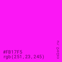 Цвет #FB17F5 в цветовой модели RGB обозначается тремя октетами (251, 23, 245) в десятичном формате и #FB17F5 в шестнадцатиричном (hex) формате, которые являются интенсивностью красного 251 (hex FB), интенсивность зелёного 23 (hex 17) и интенсивность синего 245 (hex F5).