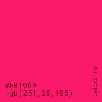 Цвет #FB1969 в цветовой модели RGB обозначается тремя октетами (251, 25, 105) в десятичном формате и #FB1969 в шестнадцатиричном (hex) формате, которые являются интенсивностью красного 251 (hex FB), интенсивность зелёного 25 (hex 19) и интенсивность синего 105 (hex 69).