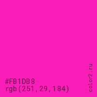 Цвет #FB1DB8 в цветовой модели RGB обозначается тремя октетами (251, 29, 184) в десятичном формате и #FB1DB8 в шестнадцатиричном (hex) формате, которые являются интенсивностью красного 251 (hex FB), интенсивность зелёного 29 (hex 1D) и интенсивность синего 184 (hex B8).
