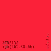 Цвет #FB2138 в цветовой модели RGB обозначается тремя октетами (251, 33, 56) в десятичном формате и #FB2138 в шестнадцатиричном (hex) формате, которые являются интенсивностью красного 251 (hex FB), интенсивность зелёного 33 (hex 21) и интенсивность синего 56 (hex 38).