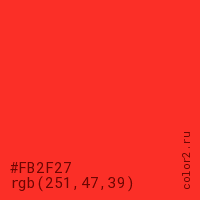 Цвет #FB2F27 в цветовой модели RGB обозначается тремя октетами (251, 47, 39) в десятичном формате и #FB2F27 в шестнадцатиричном (hex) формате, которые являются интенсивностью красного 251 (hex FB), интенсивность зелёного 47 (hex 2F) и интенсивность синего 39 (hex 27).