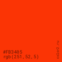 Цвет #FB3405 в цветовой модели RGB обозначается тремя октетами (251, 52, 5) в десятичном формате и #FB3405 в шестнадцатиричном (hex) формате, которые являются интенсивностью красного 251 (hex FB), интенсивность зелёного 52 (hex 34) и интенсивность синего 5 (hex 05).