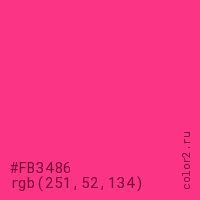 Цвет #FB3486 в цветовой модели RGB обозначается тремя октетами (251, 52, 134) в десятичном формате и #FB3486 в шестнадцатиричном (hex) формате, которые являются интенсивностью красного 251 (hex FB), интенсивность зелёного 52 (hex 34) и интенсивность синего 134 (hex 86).
