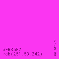 Цвет #FB35F2 в цветовой модели RGB обозначается тремя октетами (251, 53, 242) в десятичном формате и #FB35F2 в шестнадцатиричном (hex) формате, которые являются интенсивностью красного 251 (hex FB), интенсивность зелёного 53 (hex 35) и интенсивность синего 242 (hex F2).