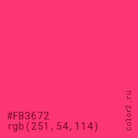 Цвет #FB3672 в цветовой модели RGB обозначается тремя октетами (251, 54, 114) в десятичном формате и #FB3672 в шестнадцатиричном (hex) формате, которые являются интенсивностью красного 251 (hex FB), интенсивность зелёного 54 (hex 36) и интенсивность синего 114 (hex 72).
