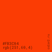 Цвет #FB3C04 в цветовой модели RGB обозначается тремя октетами (251, 60, 4) в десятичном формате и #FB3C04 в шестнадцатиричном (hex) формате, которые являются интенсивностью красного 251 (hex FB), интенсивность зелёного 60 (hex 3C) и интенсивность синего 4 (hex 04).