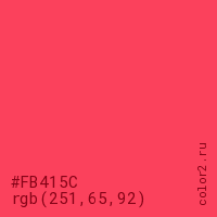 Цвет #FB415C в цветовой модели RGB обозначается тремя октетами (251, 65, 92) в десятичном формате и #FB415C в шестнадцатиричном (hex) формате, которые являются интенсивностью красного 251 (hex FB), интенсивность зелёного 65 (hex 41) и интенсивность синего 92 (hex 5C).