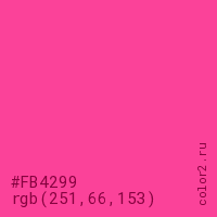 Цвет #FB4299 в цветовой модели RGB обозначается тремя октетами (251, 66, 153) в десятичном формате и #FB4299 в шестнадцатиричном (hex) формате, которые являются интенсивностью красного 251 (hex FB), интенсивность зелёного 66 (hex 42) и интенсивность синего 153 (hex 99).