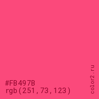 Цвет #FB497B в цветовой модели RGB обозначается тремя октетами (251, 73, 123) в десятичном формате и #FB497B в шестнадцатиричном (hex) формате, которые являются интенсивностью красного 251 (hex FB), интенсивность зелёного 73 (hex 49) и интенсивность синего 123 (hex 7B).