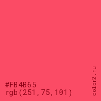 Цвет #FB4B65 в цветовой модели RGB обозначается тремя октетами (251, 75, 101) в десятичном формате и #FB4B65 в шестнадцатиричном (hex) формате, которые являются интенсивностью красного 251 (hex FB), интенсивность зелёного 75 (hex 4B) и интенсивность синего 101 (hex 65).