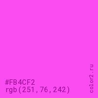 Цвет #FB4CF2 в цветовой модели RGB обозначается тремя октетами (251, 76, 242) в десятичном формате и #FB4CF2 в шестнадцатиричном (hex) формате, которые являются интенсивностью красного 251 (hex FB), интенсивность зелёного 76 (hex 4C) и интенсивность синего 242 (hex F2).