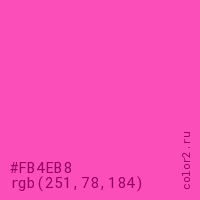 Цвет #FB4EB8 в цветовой модели RGB обозначается тремя октетами (251, 78, 184) в десятичном формате и #FB4EB8 в шестнадцатиричном (hex) формате, которые являются интенсивностью красного 251 (hex FB), интенсивность зелёного 78 (hex 4E) и интенсивность синего 184 (hex B8).