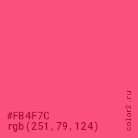 Цвет #FB4F7C в цветовой модели RGB обозначается тремя октетами (251, 79, 124) в десятичном формате и #FB4F7C в шестнадцатиричном (hex) формате, которые являются интенсивностью красного 251 (hex FB), интенсивность зелёного 79 (hex 4F) и интенсивность синего 124 (hex 7C).
