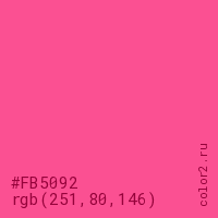 Цвет #FB5092 в цветовой модели RGB обозначается тремя октетами (251, 80, 146) в десятичном формате и #FB5092 в шестнадцатиричном (hex) формате, которые являются интенсивностью красного 251 (hex FB), интенсивность зелёного 80 (hex 50) и интенсивность синего 146 (hex 92).