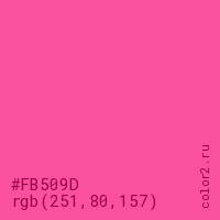 Цвет #FB509D в цветовой модели RGB обозначается тремя октетами (251, 80, 157) в десятичном формате и #FB509D в шестнадцатиричном (hex) формате, которые являются интенсивностью красного 251 (hex FB), интенсивность зелёного 80 (hex 50) и интенсивность синего 157 (hex 9D).