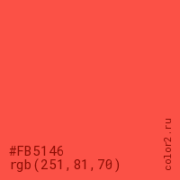 Цвет #FB5146 в цветовой модели RGB обозначается тремя октетами (251, 81, 70) в десятичном формате и #FB5146 в шестнадцатиричном (hex) формате, которые являются интенсивностью красного 251 (hex FB), интенсивность зелёного 81 (hex 51) и интенсивность синего 70 (hex 46).