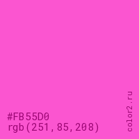 Цвет #FB55D0 в цветовой модели RGB обозначается тремя октетами (251, 85, 208) в десятичном формате и #FB55D0 в шестнадцатиричном (hex) формате, которые являются интенсивностью красного 251 (hex FB), интенсивность зелёного 85 (hex 55) и интенсивность синего 208 (hex D0).