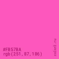 Цвет #FB57BA в цветовой модели RGB обозначается тремя октетами (251, 87, 186) в десятичном формате и #FB57BA в шестнадцатиричном (hex) формате, которые являются интенсивностью красного 251 (hex FB), интенсивность зелёного 87 (hex 57) и интенсивность синего 186 (hex BA).