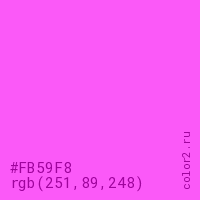 Цвет #FB59F8 в цветовой модели RGB обозначается тремя октетами (251, 89, 248) в десятичном формате и #FB59F8 в шестнадцатиричном (hex) формате, которые являются интенсивностью красного 251 (hex FB), интенсивность зелёного 89 (hex 59) и интенсивность синего 248 (hex F8).